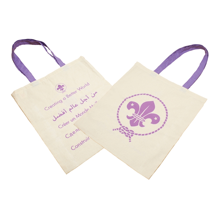 - 5oz Unbleached natural cotton with bright purple long handles and print