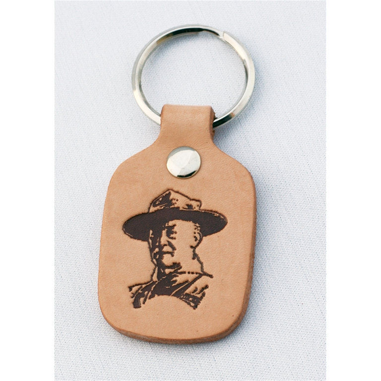 - Metal keyring with leather fob embossed with iconic image of the founder.